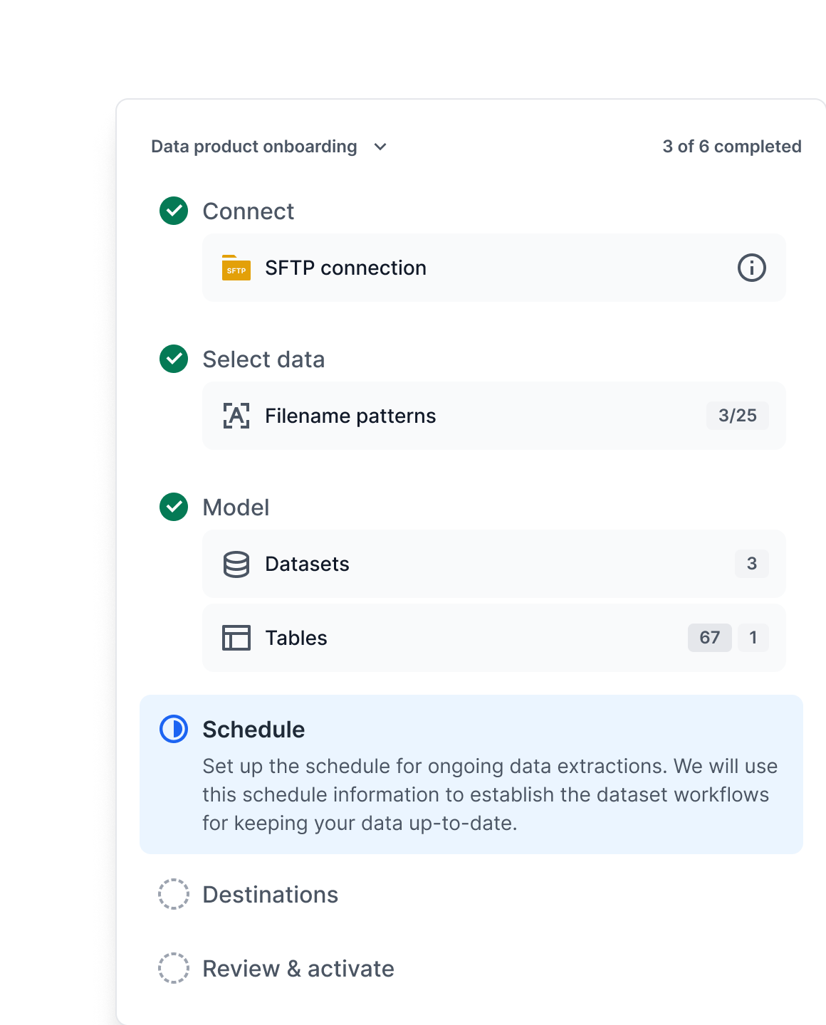 Automate data profiling, normalization, and scheduling - so you can onboard in minutes, not months.